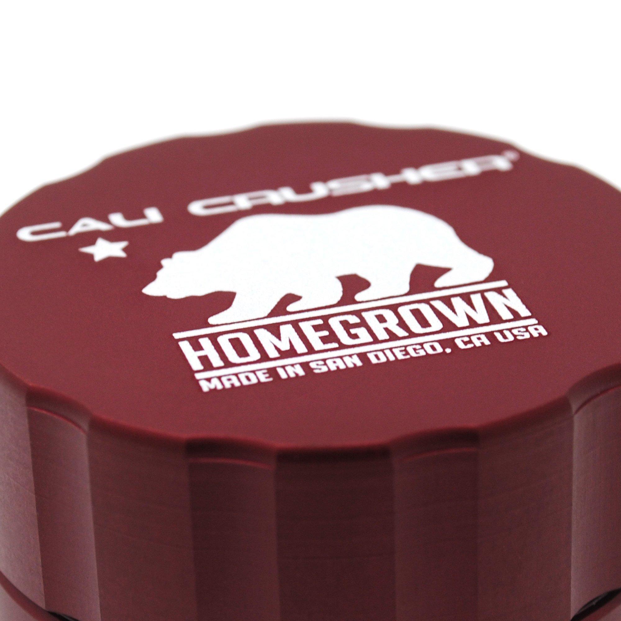 Cali Crusher presents the revolutionary American-made Homegrown® Grinder. This designer herb grinder is packed with new and unseen features. Our patented 4-Way Quick Lock System replaces traditional threads, and eliminates the possibility of cross-threading or jamming your grinder. Our 210 count micron screen can be easily removed and upgraded using a 3/32 inch hex wrench. Our grinders are manufactured with high-quality 6061 aerospace aluminum and come with type II anodized protection. Cali Crusher Homegrowns utilize powerful neodymium earth magnets to ensure a strong hold. They are bead blasted, producing a scratch resistant finish. An ultrasonic cleanse leaves them free of metal shavings and CNC fluid application makes this product medical grade. Homegrown’s larger drop holes allow for a free flow grind with no obstruction and the removable O-ring provides a smooth twisting action. Our rounded bottom chamber is the first of its kind and makes pollen collection simple and easy. The teeth come with a lifetime guarantee. Proudly manufactured in San Diego, California.