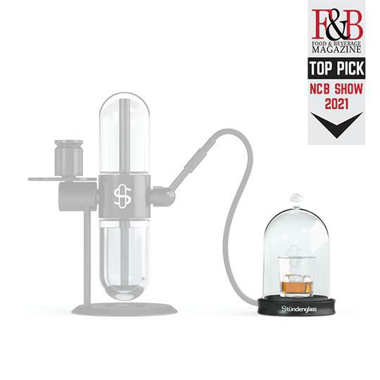 Attach the silicone hose to the mouthpiece and the other end to the cloche. Activate the Stündenglass to generate smoke, then rotate to push the smoke into the cloche, surrounding your beverage with flavor and aroma.