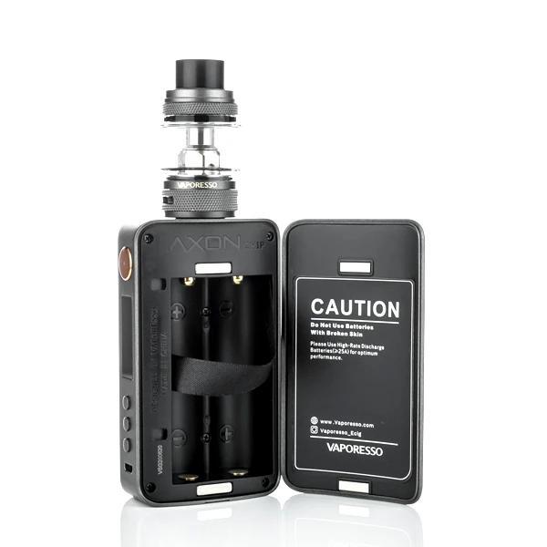 The Vaporesso GEN S mod features a soft touch finish made from four layers of coating and is constructed from zinc alloy. This enables the device to have a fairly durable chassis while offering a soft rubber-like feel, for maximum grip. The GEN S utilizes two 18650 vape batteries (sold separately), which are accessible via a dual magnetic battery access panel located on the back of the device. At the heart of the GEN S is Vaporesso’s AXON chipset with easy to use features as well as advanced DIY features. The AXON is designed to output high power for new users, while still offering advanced features that many seasoned vapers enjoy. The utilization of auto-recognizing coils, presets the working mode to match the coil type. The AXON features a pulse mode that will continuously supply the atomizer with bursts of power for even heating and maximized flavor and vapor output. The GEN vape mod, along with the AXON chipset, uses a four button control interface for simple navigation and adjustments. Vaporesso added beautiful accents to the GEN with a bronzed over-sized firing button and bronzed stainless steel 510 connection.